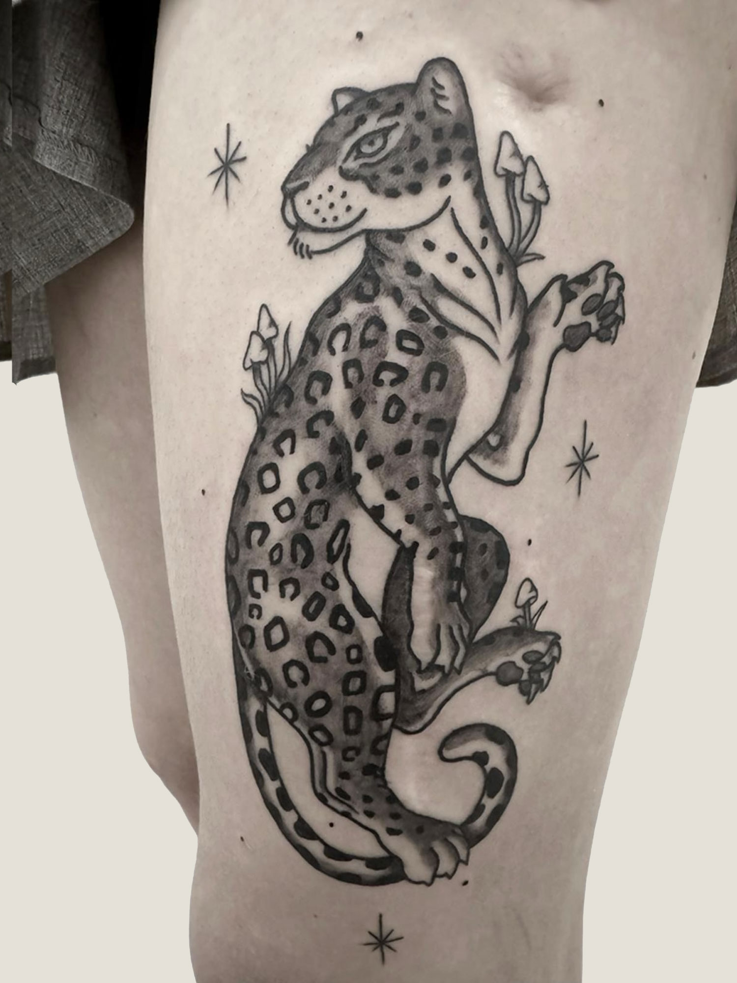 Soy Angela artista del tatuaje en Coyote Spike. Mi trabajo se centra en crear piezas únicas, ornamentales y personalizadas, con especial cuidado en resaltar y acompañar la anatomía de cada persona. Trabajo estilos tradicionales coloridos, blackwork y coberturas de cicatrices, siempre desde un enfoque creativo y auténtico.