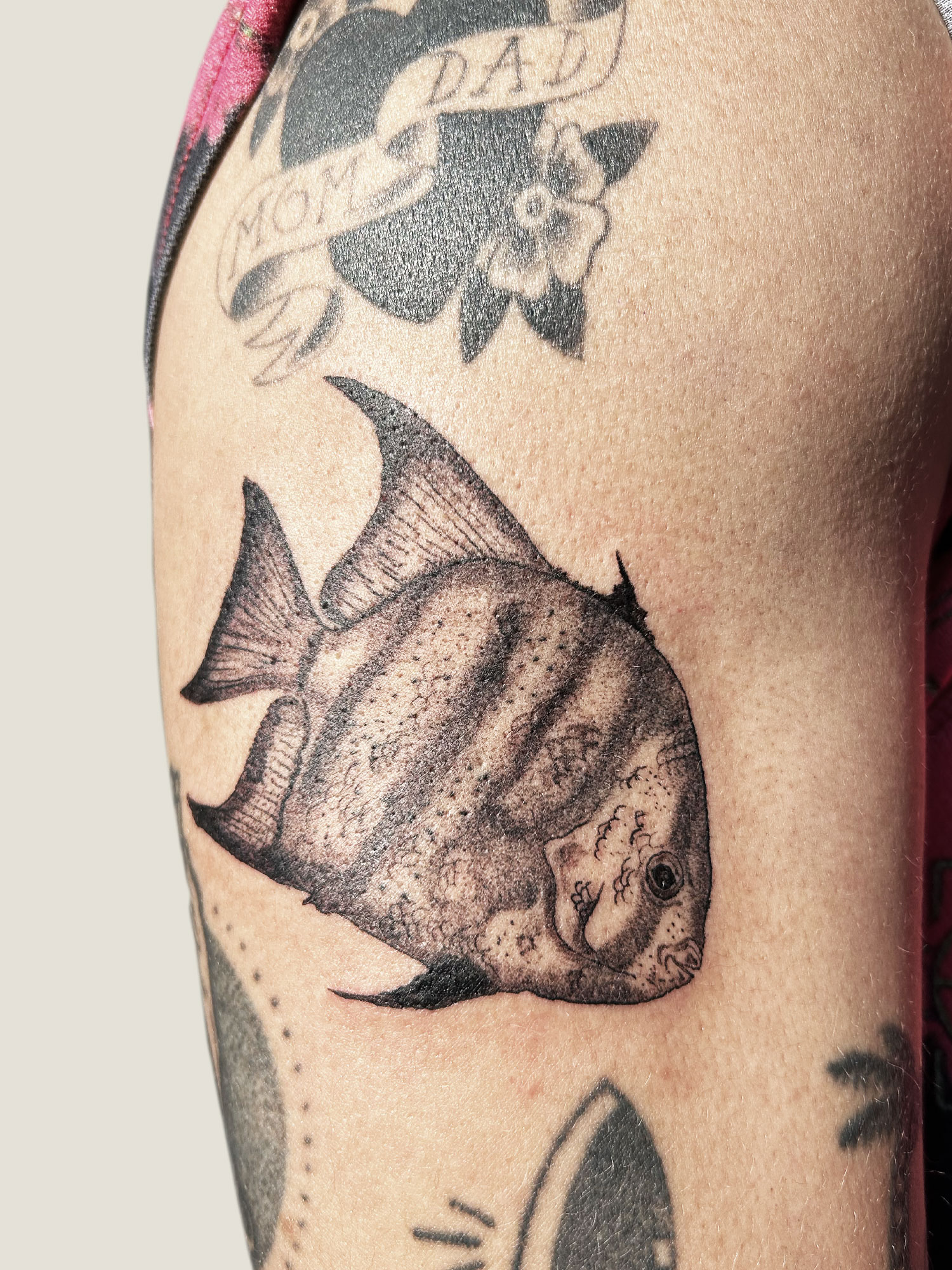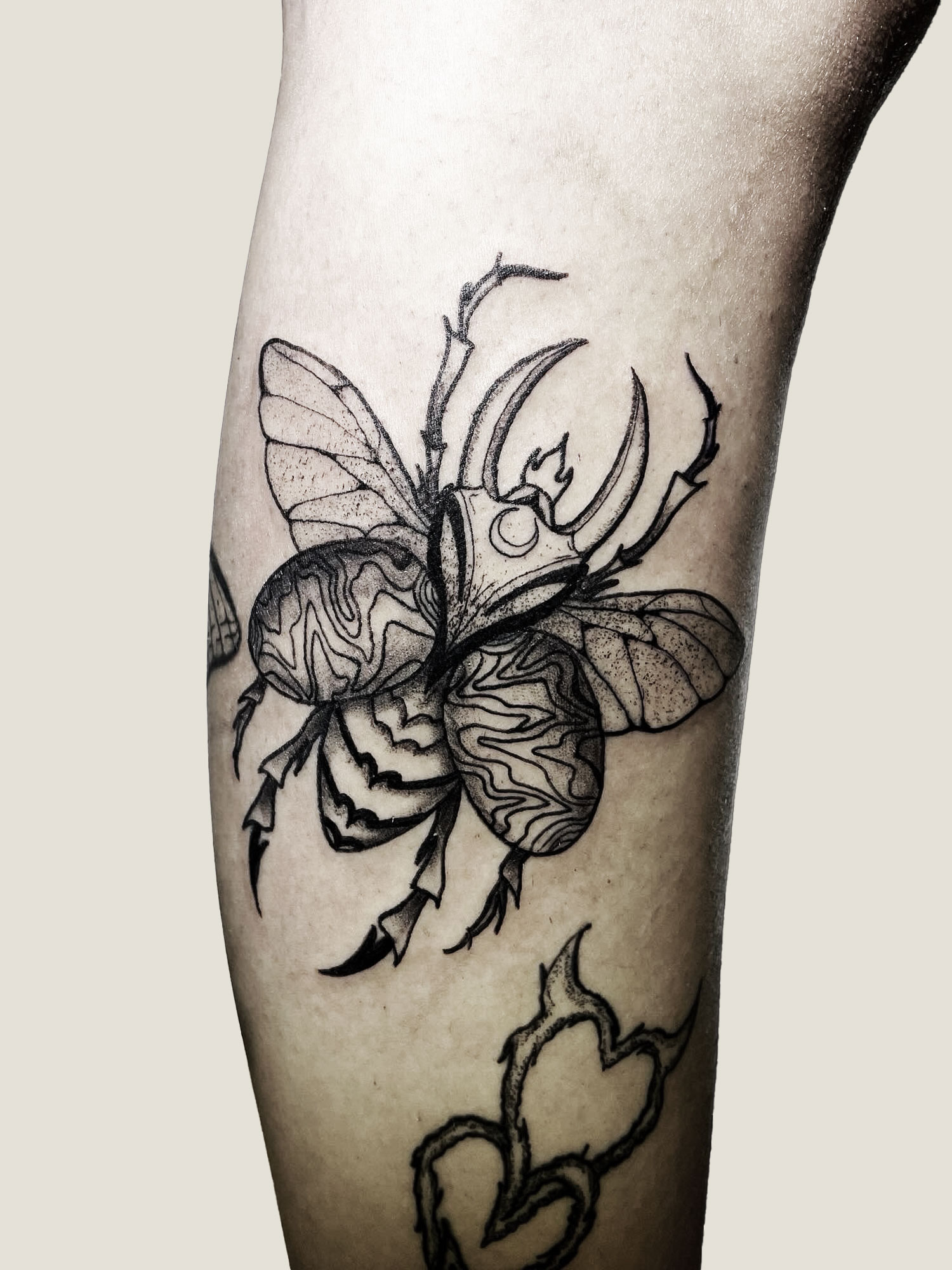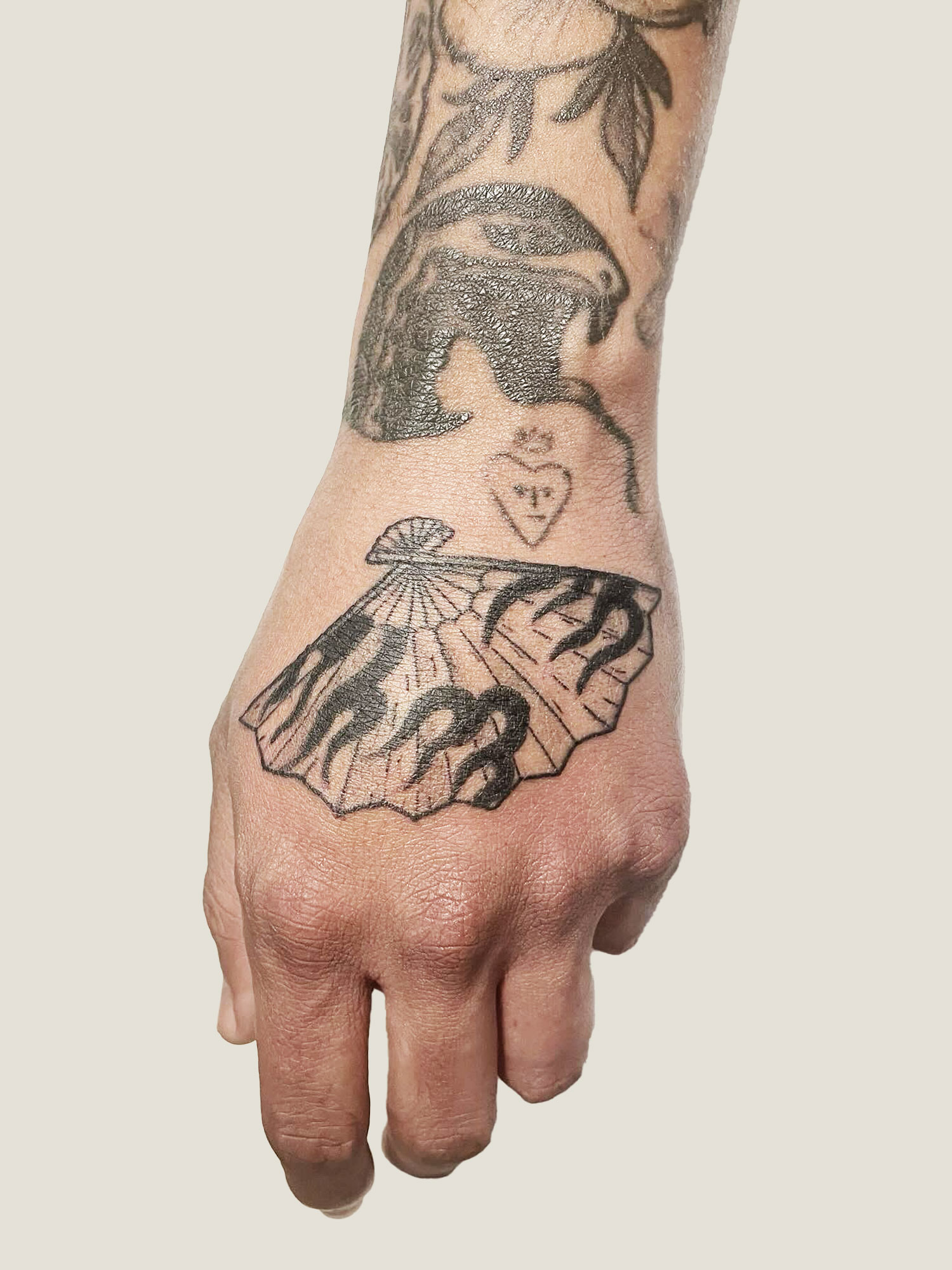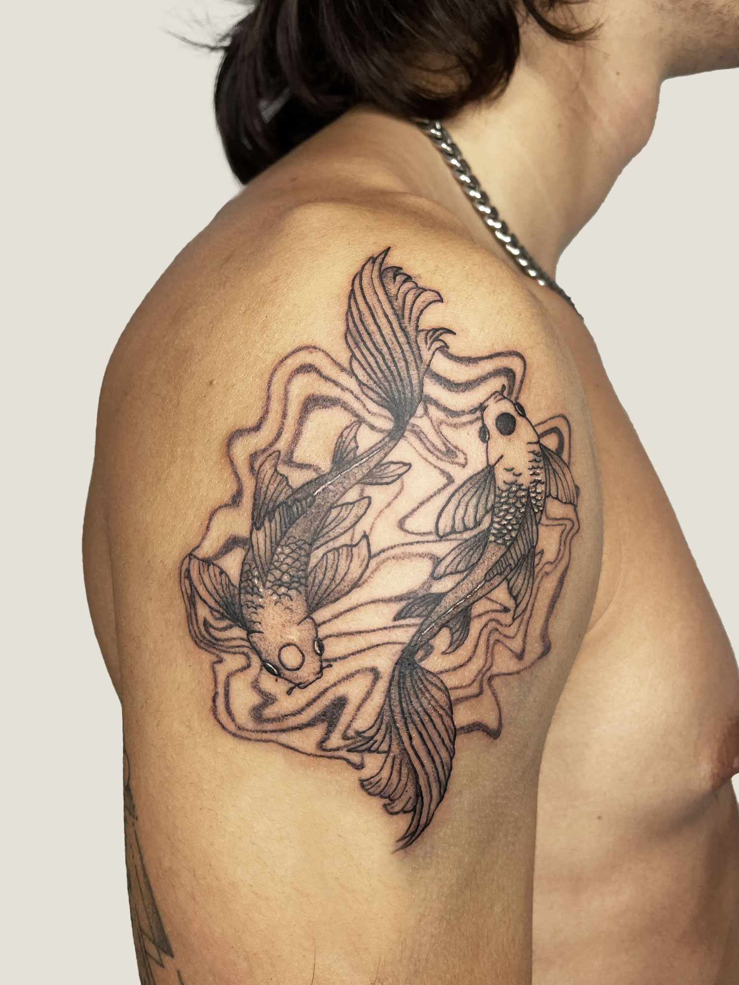 Soy Diego, tengo 26 años y hace 3 que Barcelona es mi casa. Tatuo en Coyote Spike Tattoo, donde mezclo el blackwork ilustrativo con detalles orgánicos y texturas inspiradas en el suminagashi — me gusta crear piezas únicas, con alma y movimiento.