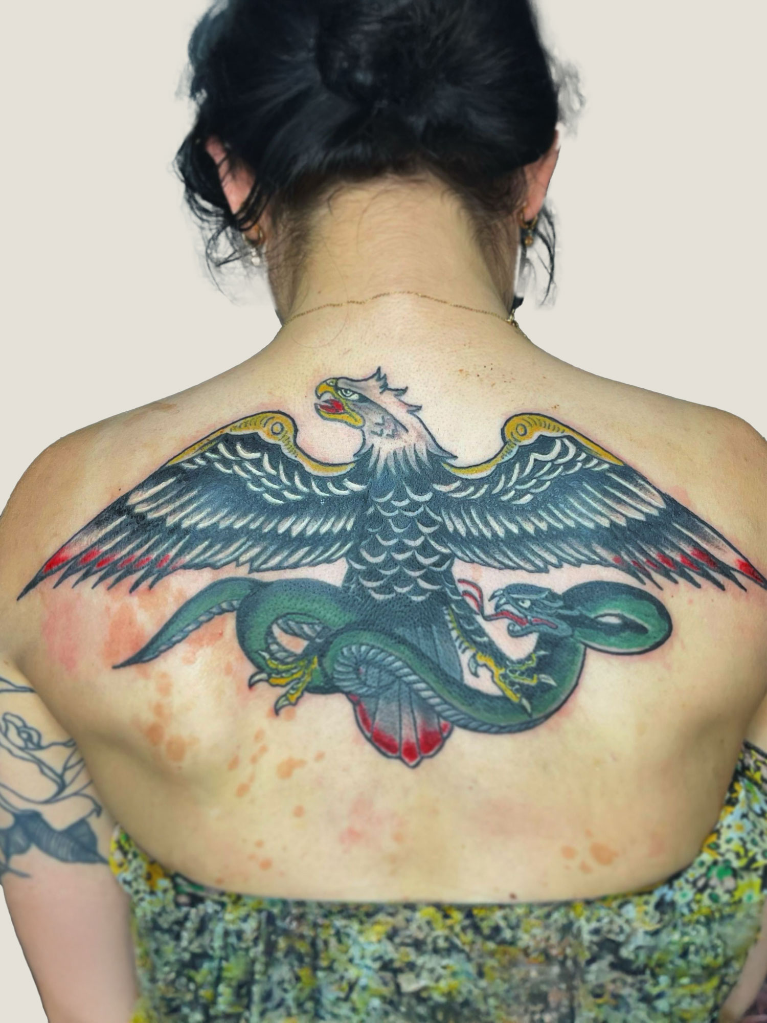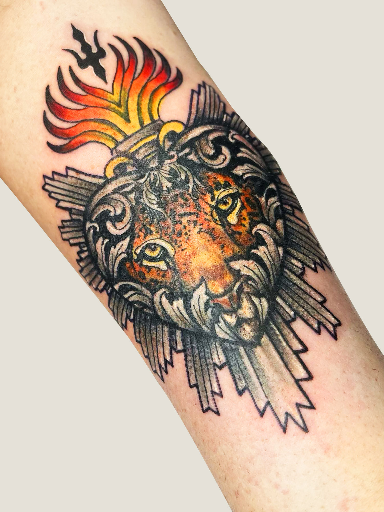 años de experiencia profesional y más de 13 años vinculado al mundo del tatuaje. Su estilo principal es el tradicional, al que imprime un sello personal con influencias mexicanas, aunque también se mueve con soltura en otros estilos. Ha tatuado en distintos lugares, acumulando aprendizajes que se reflejan en la riqueza de su trazo y enfoque.